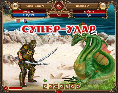 Как только будет угадана правильная комбинация ударов на экране с текущим боем Вы увидите сообщение «Супер-удар», будет отображено количество нанесенного урона от простого удара и бонусы для данного супер-удара. Также, в правом верхнем углу экрана с боем, появляется иконка в случае, если супер-удар влечет последствия в виде оглушения противника или потери жизни. Иконка сохраняется всё время, которое противник подвержен эффекту.