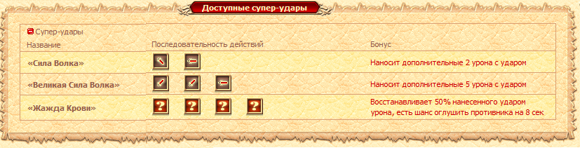 В соответствии с уровнем Вашего персонажа на данной закладке отображается доступное количество супер-ударов, последовательность действий и бонус по каждому удару.