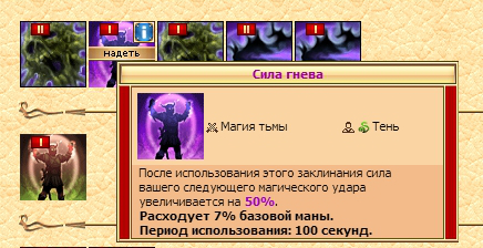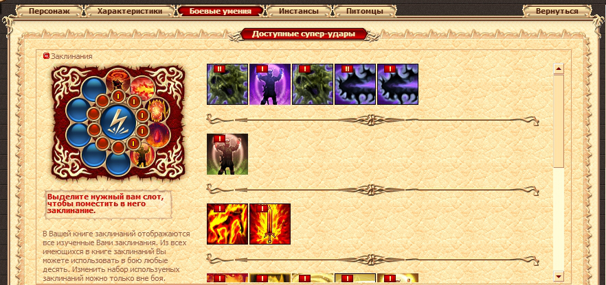 Чтобы заменить используемое заклинание на другое, нужно навести курсор на выбранное заклинание и нажать «Надеть».