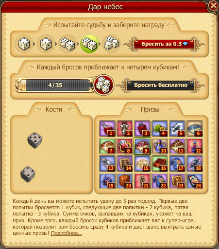 Всего можно сделать 5 бросков в день: первый - бесплатно, второй и третий - за серебро, а четвертый и пятый - за бриллианты. Каждый бросок выигрышный, а сумма чисел на костях определяет номер ячейки с ценностями. Сделав 35 бросков (не важно, сколько бросков в день вы делали, главное в сумме набрать 35 бросков) вы получаете доступ к Суперигре, в которой у вас есть возможность получить особо ценные призы благодаря 4-м одновременно брошенным костям.