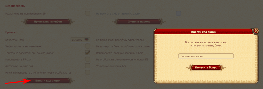 1) Поле для ввода промо-кода находится в анкете вашего персонажа. Анкета персонажа открывается в верхнем меню игры.